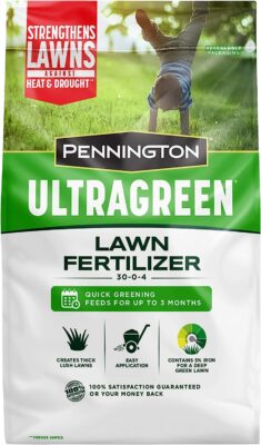 A: Any fertilizer containing phosphorus helps thicken grass. Phosphorus is a vital nutrient that helps boost root development and enhances the growth of robust plants. To thicken the Bahia lawn and make it greener, add Pennington UltraGreen Lawn Fertilizer 30-0-4 (pictured below).